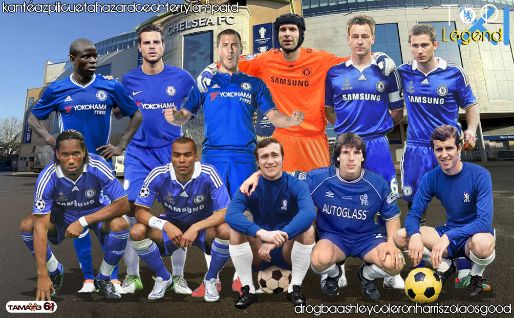 ARRIBA: N’golo Kanté, Azpilicueta, Eden Hazard, Petr Čech, John Terry, Frank Lampard. ABAJO: Drogba, Ashley Cole, Ron Harris, Gianfranco Zola, Peter Osgood.