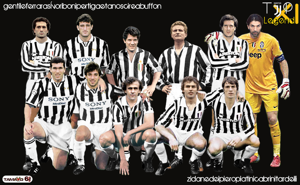 ARRIBA: Claudio Gentile, Ciro Ferrara, Omar Sívori, Boniperti, Scirea, Gigi Buffon. ABAJO: Zinédine Zidane, Alessandro del Piero, Michel Platini, Cabrini, Tardelli.