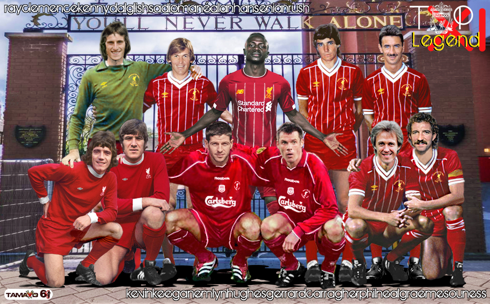 ARRIBA: Clemence, Kenny Dalglish, Sadio Mané, Alan Hansen, Ian Rush. ABAJO: Kevin Keegan, Emlyn Hughes, Steven Gerrard, Carragher, Phil Neal, Graeme Souness.
