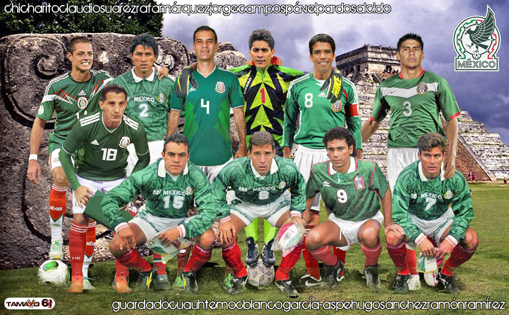 ARRIBA: Chicharito, Claudio Suárez, Rafa Márquez, Jorge Campos, Pável Pardo, Salcido. ABAJO: Guardado, Cuauhtémoc, García-Aspe, Hugo Sánchez, Ramírez.