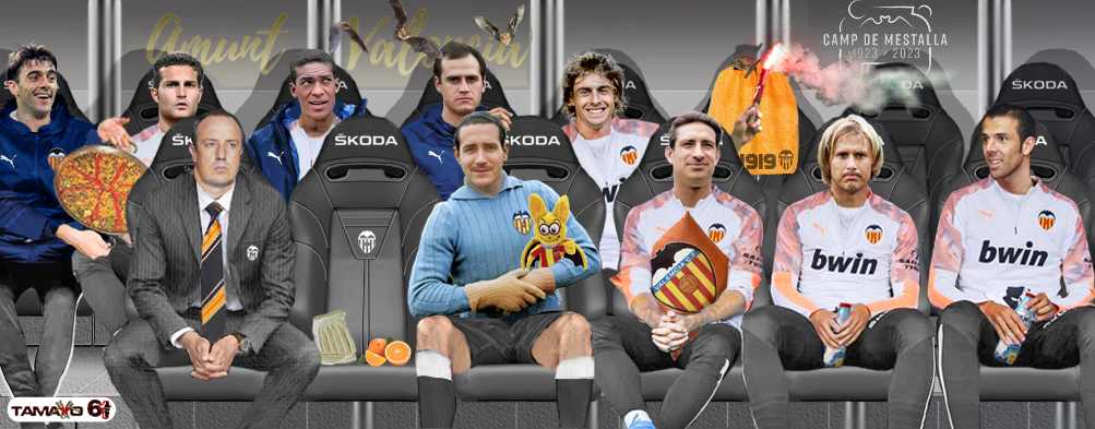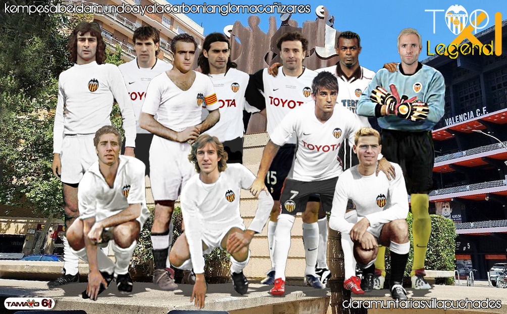 ARRIBA: Mario Alberto Kempes, David Albelda, Mundo, Ayala, Carboni, Jocelyn Angloma, Santi Cañizares. ABAJO: Claramunt, Ricardo Arias, David Villa, Puchades
